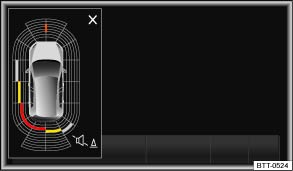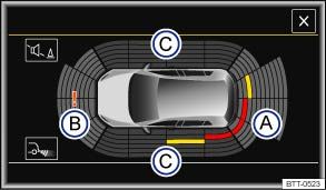The graphic on the screen displays the scanned areas in several segments. The closer the vehicle drives towards an obstacle, the closer the segment will move to the vehicle in the display. The collision area has been reached when the penultimate segment is displayed, if not before. Do not drive on!