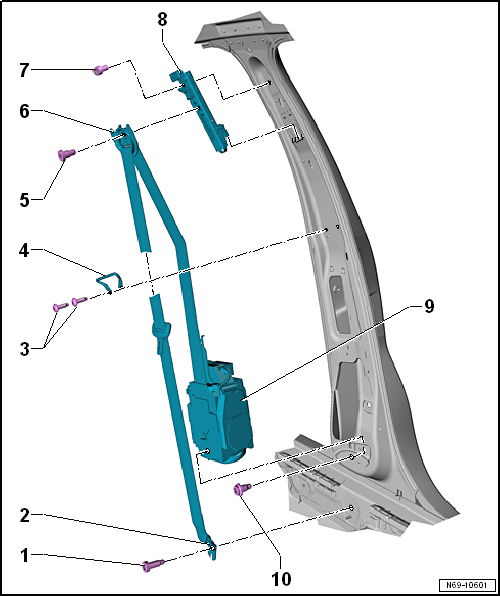 Volkswagen Golf Service & Repair Manual: Assembly overview - front three-point seat belt, 4-door model and estate