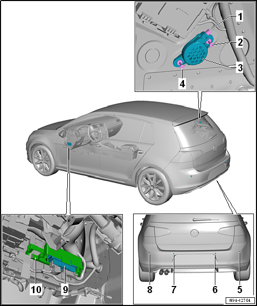 Volkswagen Golf Service & Repair Manual: Assembly overview - rear parking aid, LHD vehicles