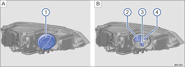 Remove the rubber cover ① on the rear of the headlight. Depending on the model, a hard plastic cover may also be fitted. Turn the cover anticlockwise and remove it. |