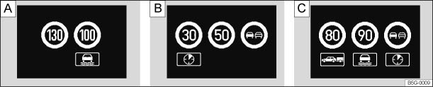 Fig. 178 In the instrument cluster display: examples of recognised speed limits or overtaking restrictions with accompanying additional signs