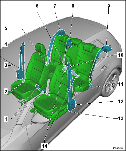 Volkswagen Golf Service & Repair Manual: Overview of fitting locations - seat belts and anchorage points, 4-door
