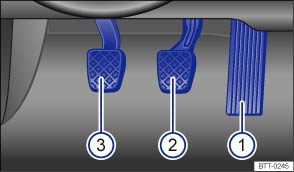 Fig. 132 Pedals in vehicles with a manual gearbox: ① accelerator, ② brake pedal, ③ clutch pedal