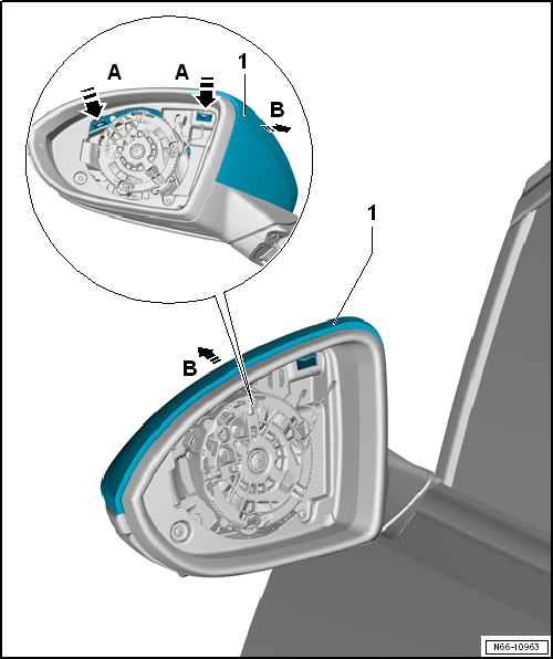 | – | Pull mirror cover -1- backwards off mirror mounting in -direction of arrow B-. |