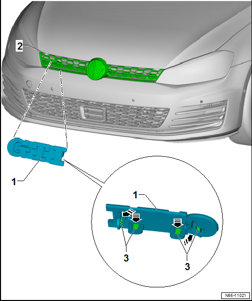 | – | Press emblem with model designation -1- onto radiator grille -3- until retaining hooks -3- engage audibly. |